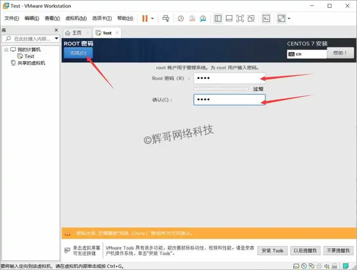 进入到安装页面只后系统会自动安装,这个时候点击ROOT密码,输入两次一样的密码,然后点击两次左上角的完成按钮
