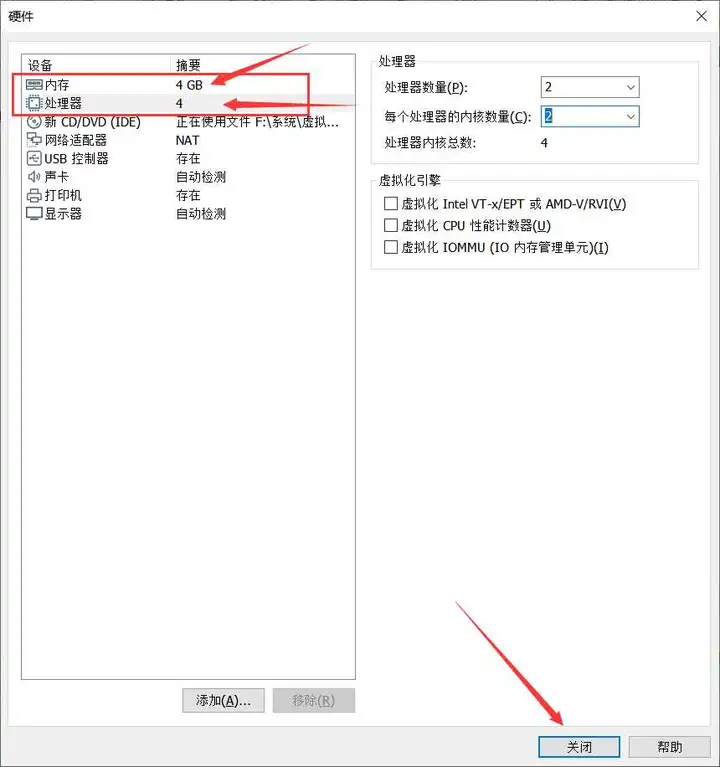点击自定义硬件 -> 点击内存(自定义内存大小)-> 点击处理器(处理器的数量也可以自己调,内核数量也是如此)-> 调好之后点击关闭 -> 点击完成