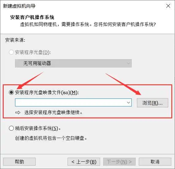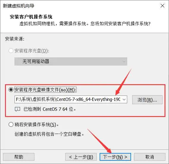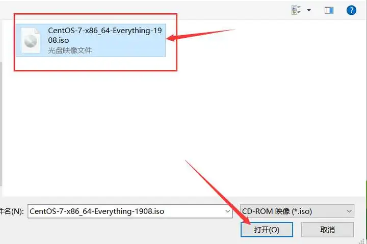 点击安装程序光盘映像文件ISO -> 点击浏览 -> 找到并选中下载的centos7系统 -> 确定