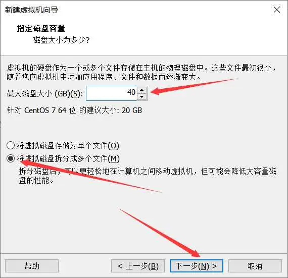 一般我们指定虚拟机的磁盘为40GB,当然默认20G也可以,可以自定义