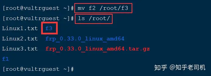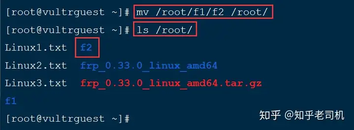 案例2:使用mv命令移动一个文件夹 将/root/f1目录下的f2文件夹运动到/root/目录下