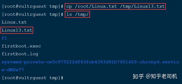 案例2:使用cp命令来复制用户家目录下的Linux.txt到/tmp/目录,并重命名为Linux13.txt